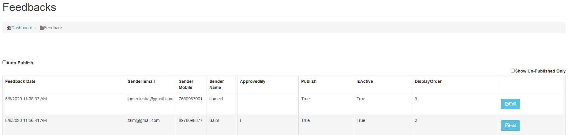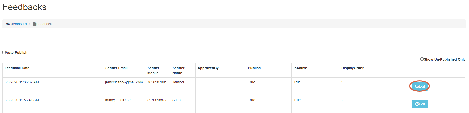 In this section of content Management System, the user can see, reply and publish feedback that has been submitted by the student on the website.